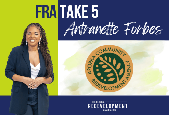 “Take 5” – 5 Questions with Antranette Forbes – City of Apopka, Economic Development Director FRA Board of Directors Q: What is your best piece of business advice for a new FRA member? Antranette: Get invested early and often. The Florida Redevelopment Association isn’t just a membership—it’s a network, a brain trust, and occasionally a…